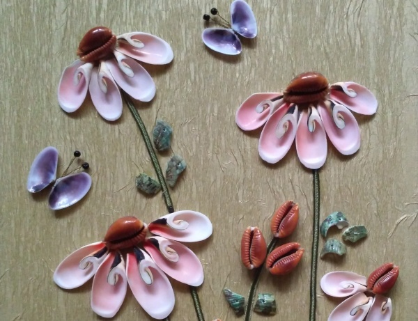Вера Кириченко с 2007 года создает интересные картины из ракушек, шишек, фруктовых и ягодных косточек, веточек, спичек, бисера, тесьмы, песка и гравия.