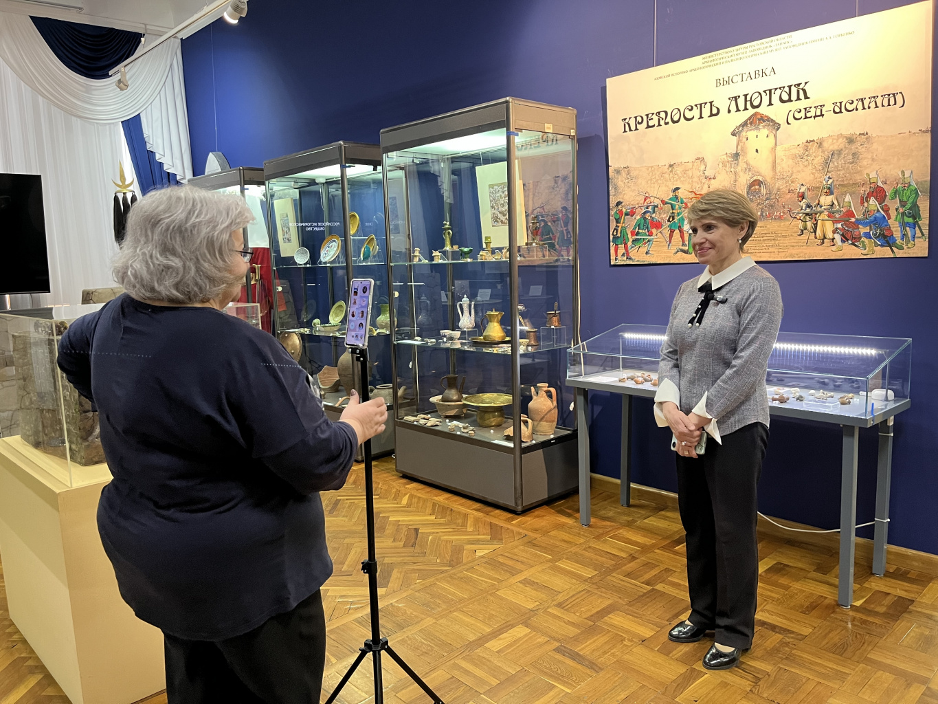 Вторая онлайн-экскурсия прошла в зале, где представлена уникальная археологическая выставка «Крепость Лютик (Сед-Ислам)», которая включает экспонаты Азовского музея-заповедника и Археологического музея-заповедника «Танаис». Во время программы ребята увидели находки археологов и научные реконструкции вооружения XVII-XVIII вв. Автор выставки, учёный секретарь музея Ирина Рудольфовна Гусач рассказала историю этого археологического памятника фортификационного искусства XVII - XVIII вв, а также подробности соперничества Османской и Российской империй за право обладания стратегически и экономически важной пограничной территорией – Северо-Восточным Приазовьем.