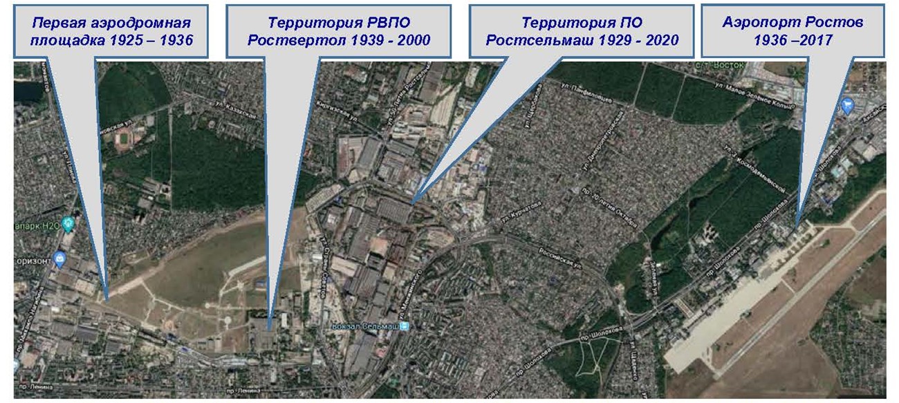 Снимок: первая аэродромная площадка (1925–1936), территория аэродрома РВПО Роствертол, территория ПО Ростсельмаш, территория аэропорта Ростов-на-Дону (1936–2017).