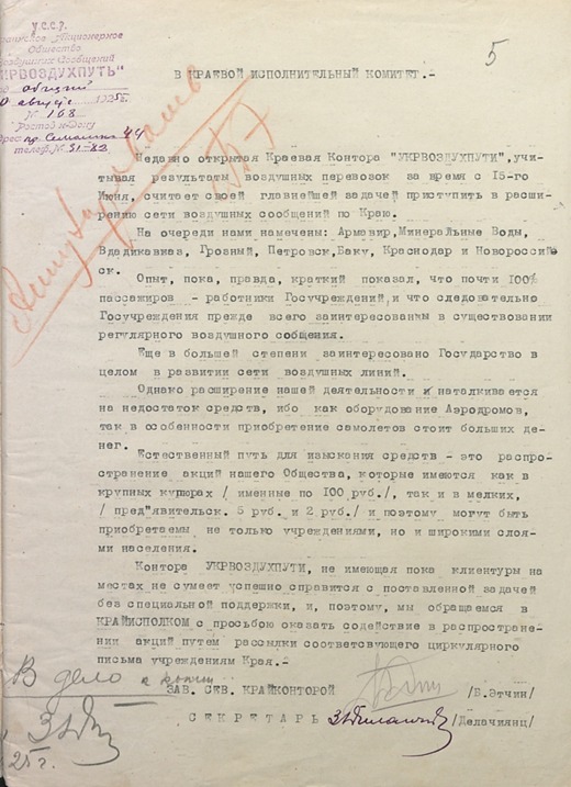 5.Одобрить намеченное КрайОСОАВИАХИМом строительство авиаэскадрильи в составе самолетов по борьбе с сельхоз вредителями, оказание помощи в содействии рыбной промышленности, для связи, перевозке литературы и работников по хозяйственно-политическим компаниям.