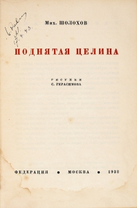Первый том книги «Поднятая целина» — роман М. А. Шолохова. Титульный лист.