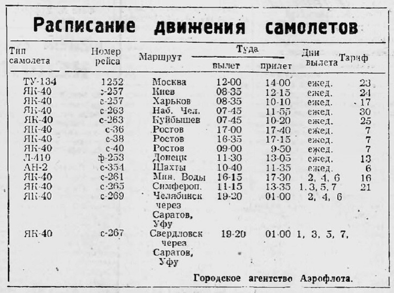 1982 январь – выполнение авиарейсов в города Самарканд, Рига, Таллин, так называемые «туристические рейсы одного дня»: рано утром вылет из Ростова, вечером обратно вылет в Ростов. Рейсы, как правило, выполнялись на самолете Ту-154 в компоновке 180 кресел, с загрузкой 100% туда и обратно.