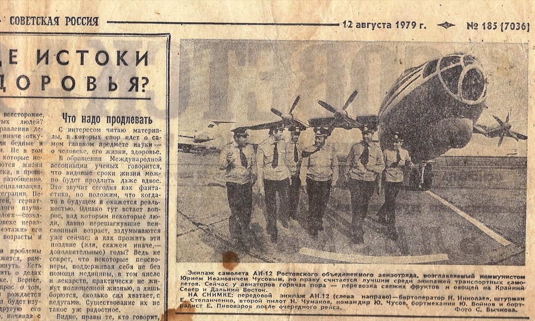 1979 август 12 (документальный факт) – фото в газете Советская Россия от 12 августа 1979 № 185 (7036): экипаж самолета Ан-12 КВС (капитан) Чусов Юрий Иванович, второй пилот Чумаков Н., штурман Степанченко Евгений Петрович, бортмеханик Войнов Ю., бортрадист Пивоваров Е.