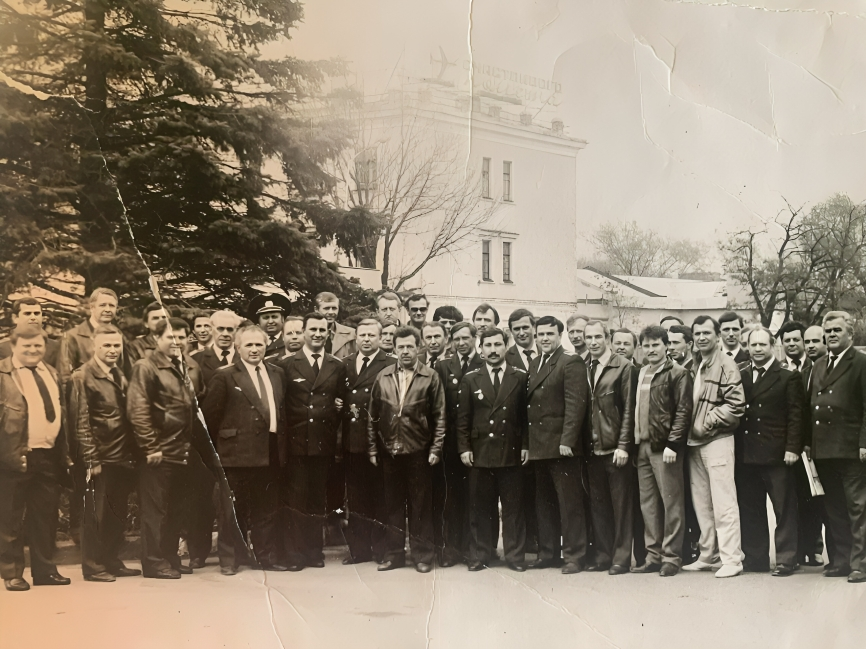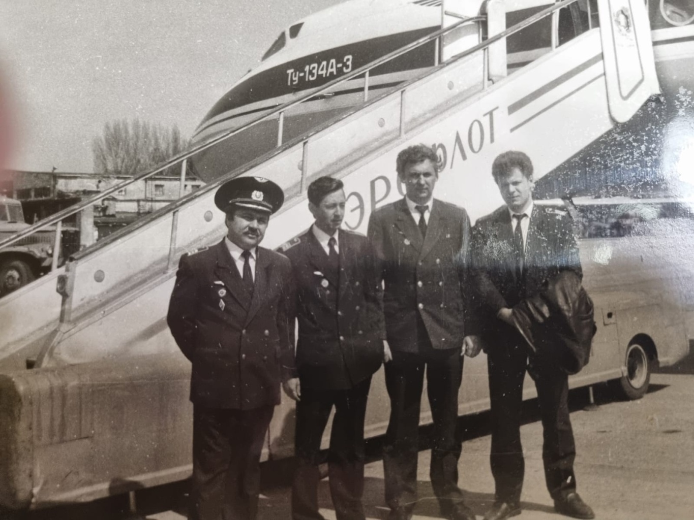 На фото слева на право: проверяющий Павел Толченов, бортпроводники Татьяна Рыбка и Марина Босенко, КВС (капитан) Анатолий Москаленко, бортпроводники – Ольга Арсеньева, Вера Гавриленко и Белла Николова. Фото от 01.04.91.